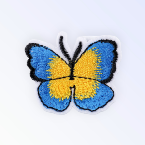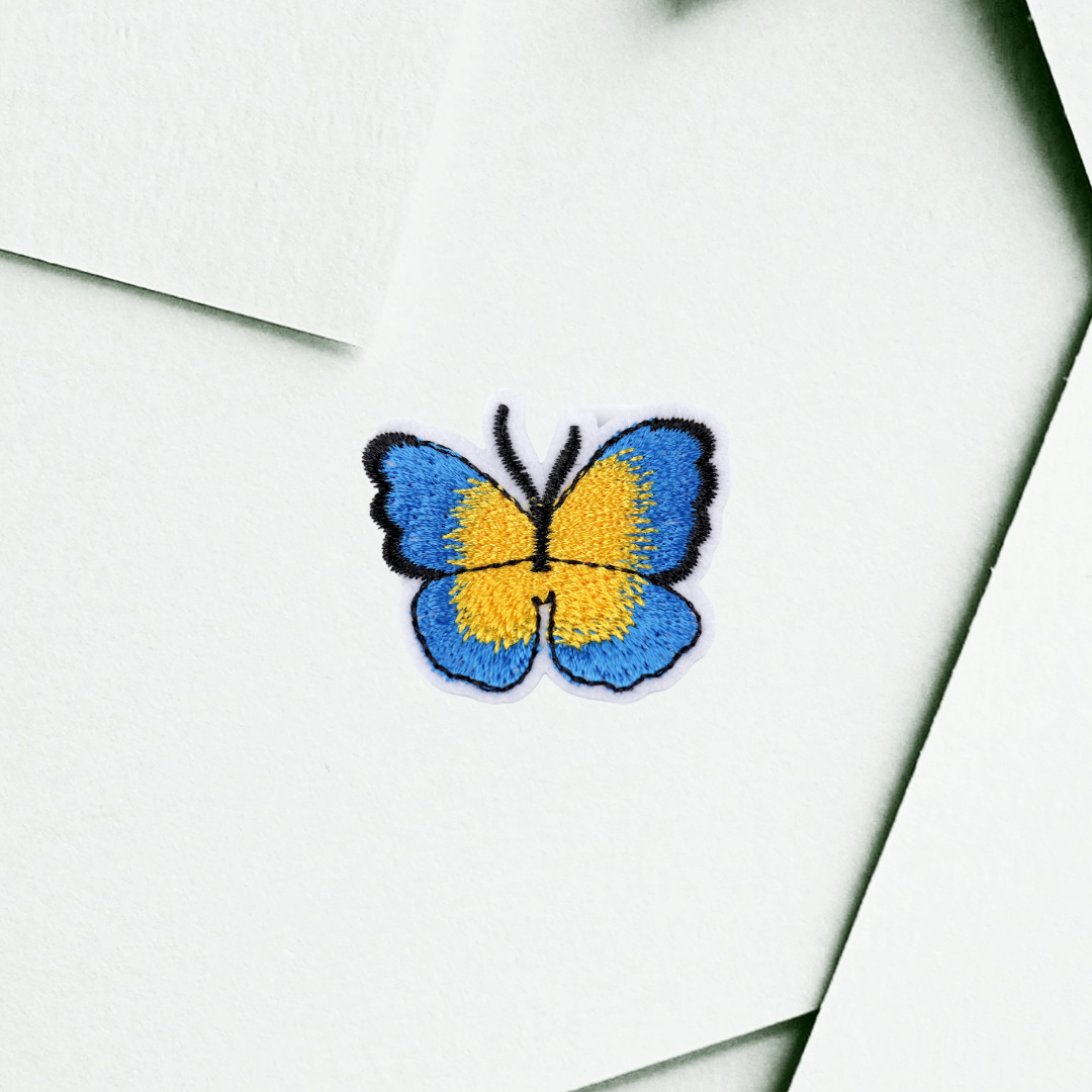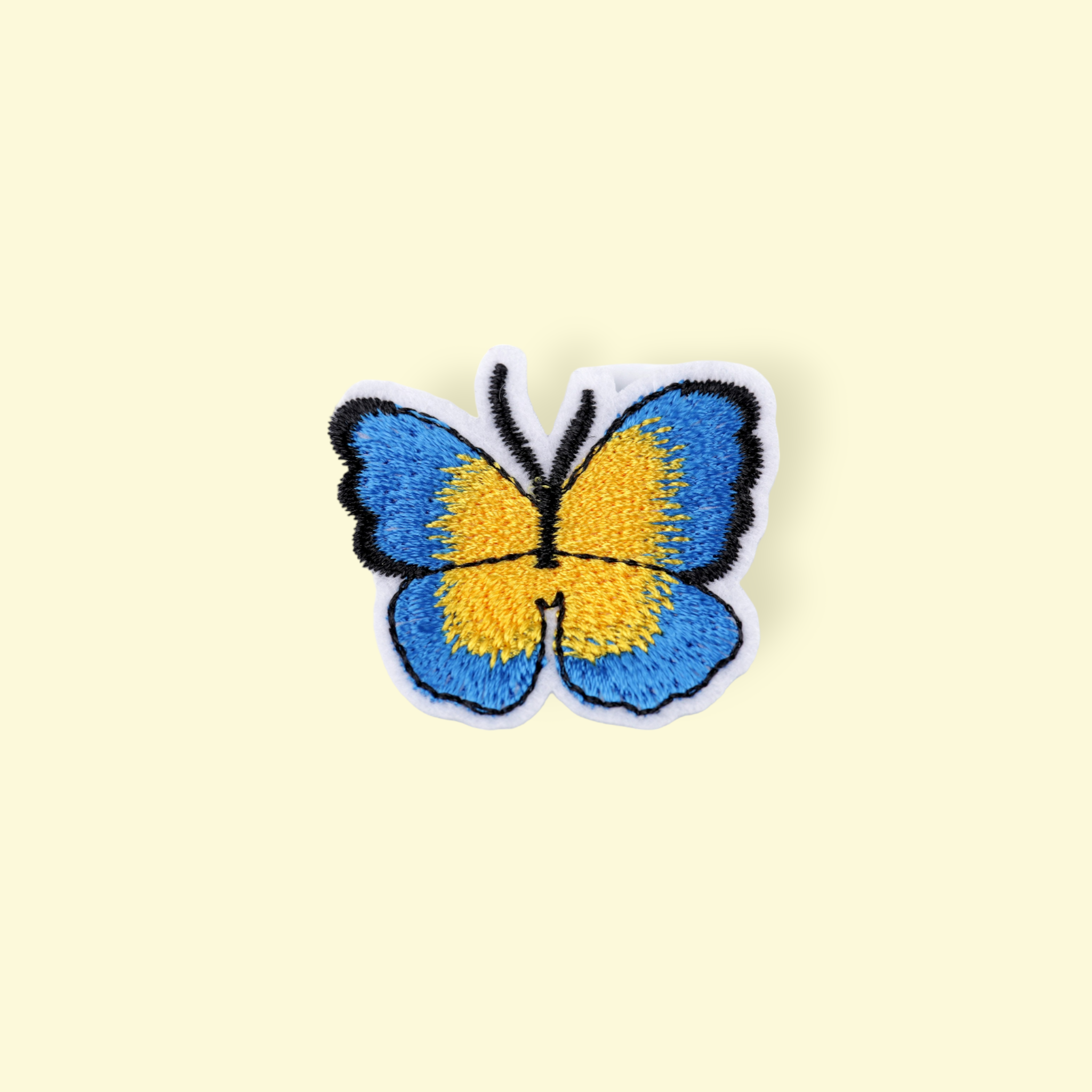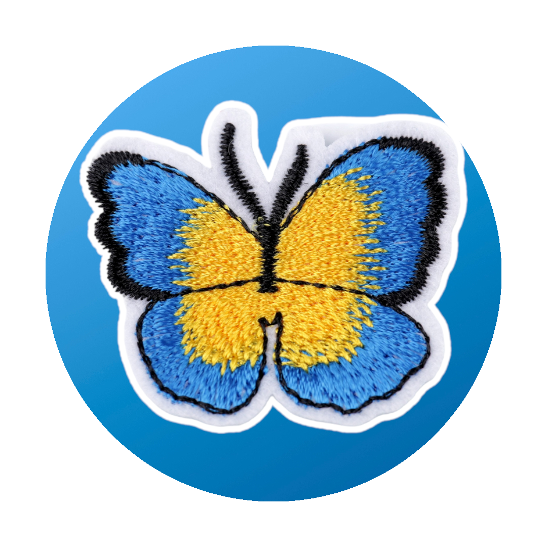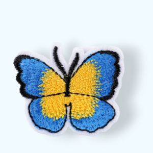 Aplicatie termoadeziva brodata, 36 x 40 mm, Fluture albastru si galben
