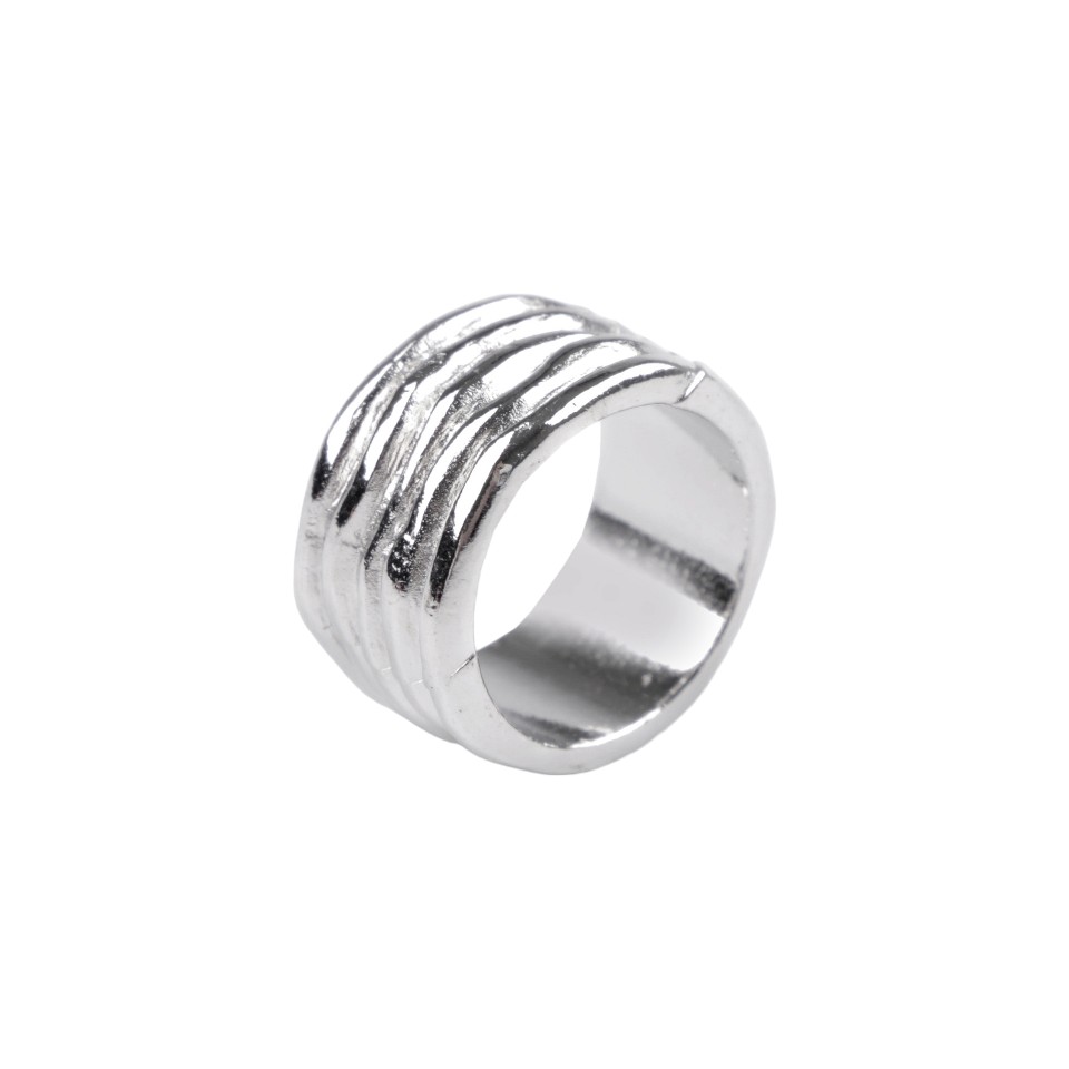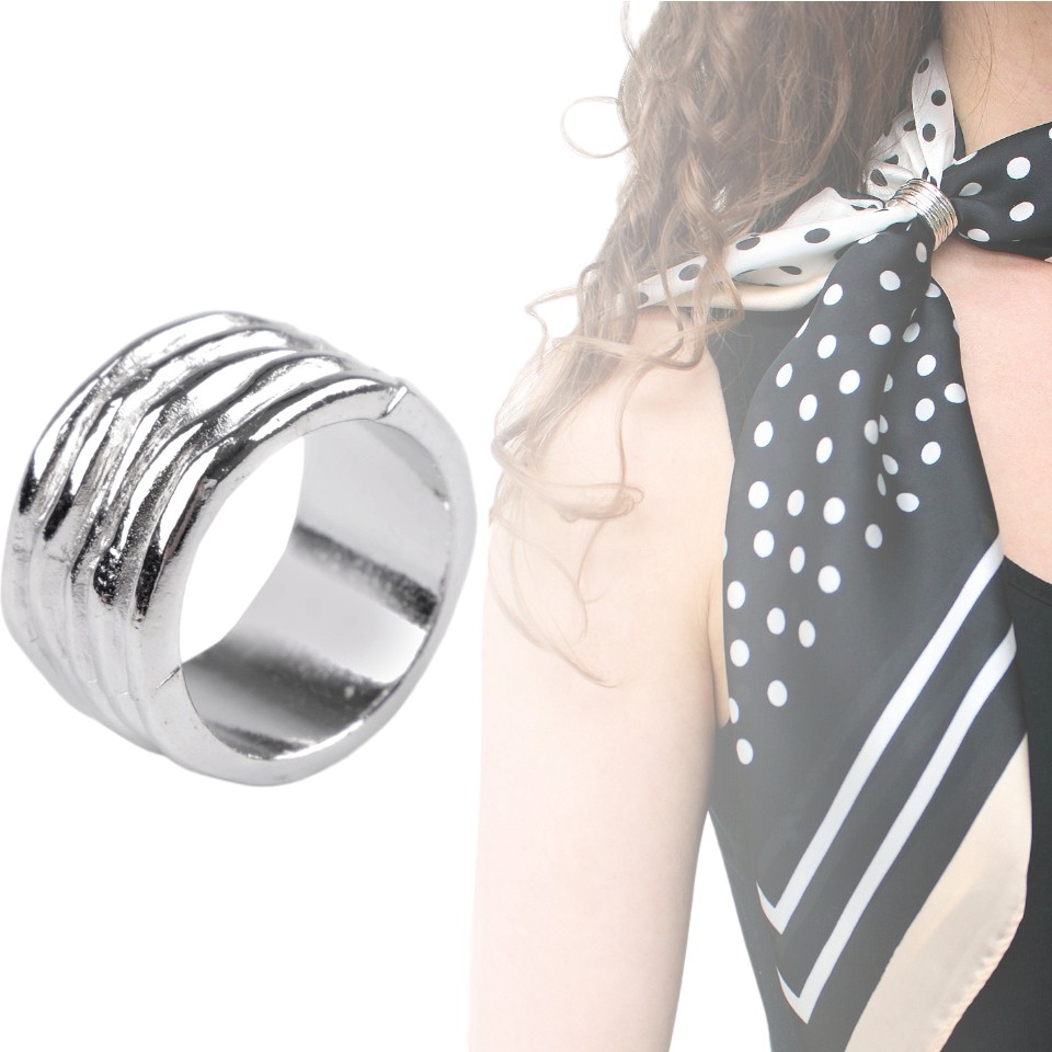 Inelul metalic elegant este decorat in relief cu dungi ondulate. Inelul arata foarte eficient in combinatie cu o esarfa moale.