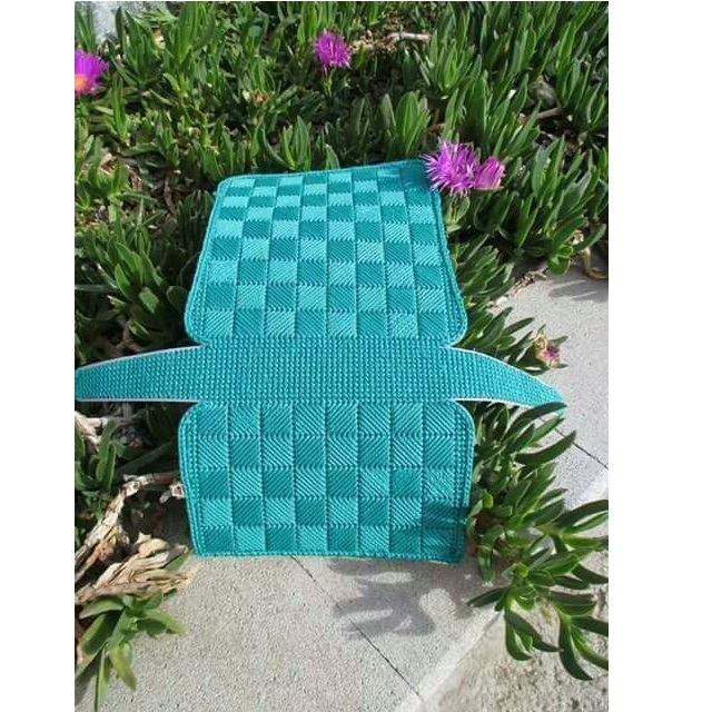 Panza de plastic este un semifabricat din care poti realiza o geanta de mana mica cu clapeta, un portofel sau o carcasa cu dimensiunile de aproximativ 15 x 7,5 x 4 cm. Pentru confectionare, utilizati fire mai puternice, care sunt destinate tricotarii sau crosetarii. De asemenea, puteti folosi un snur sau o panglica mai rezistenta.